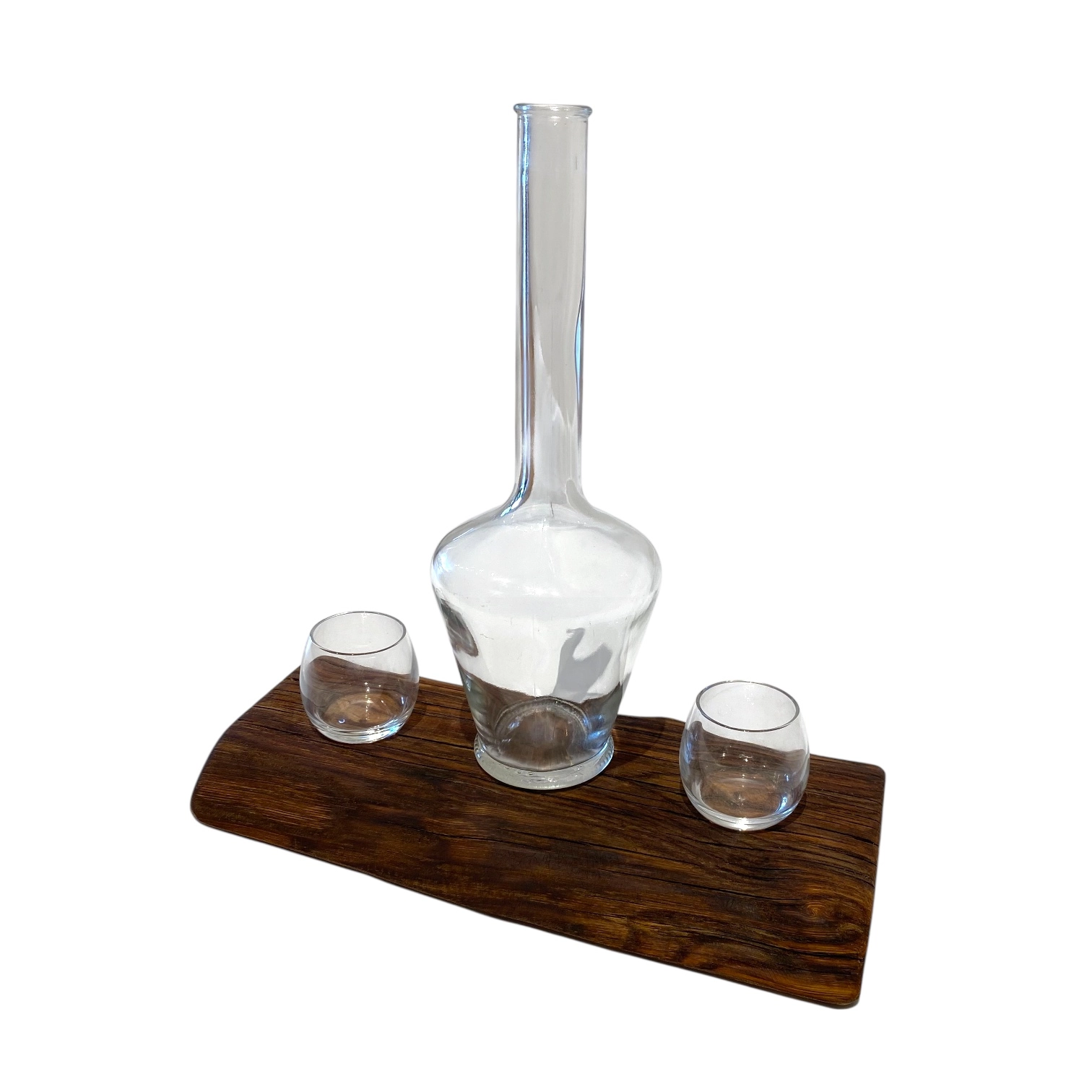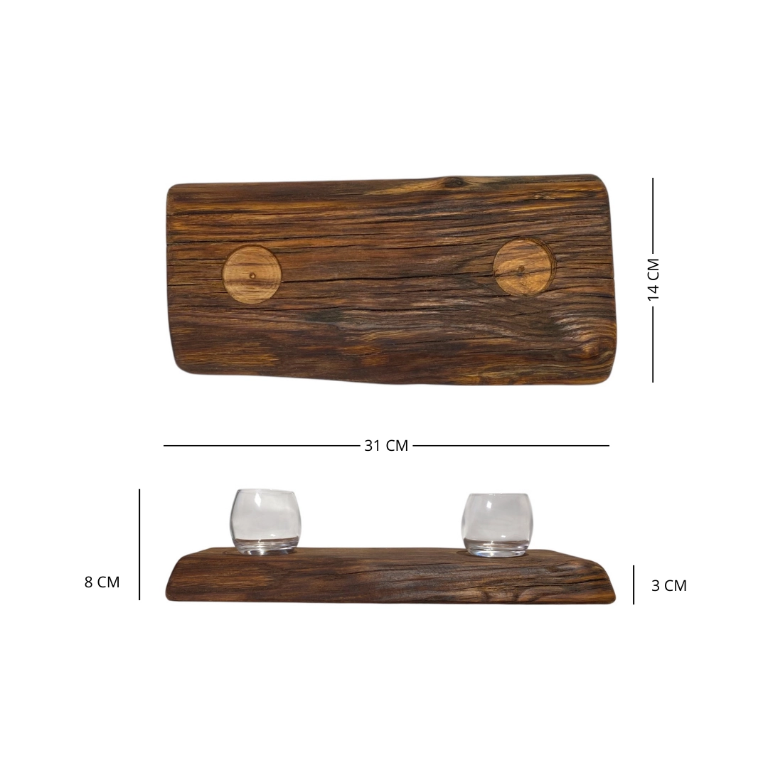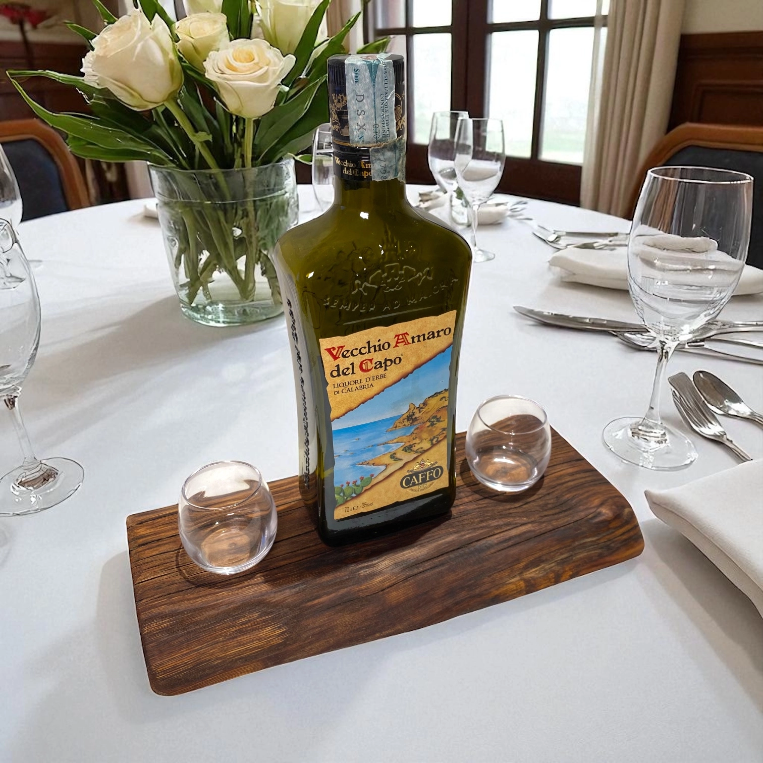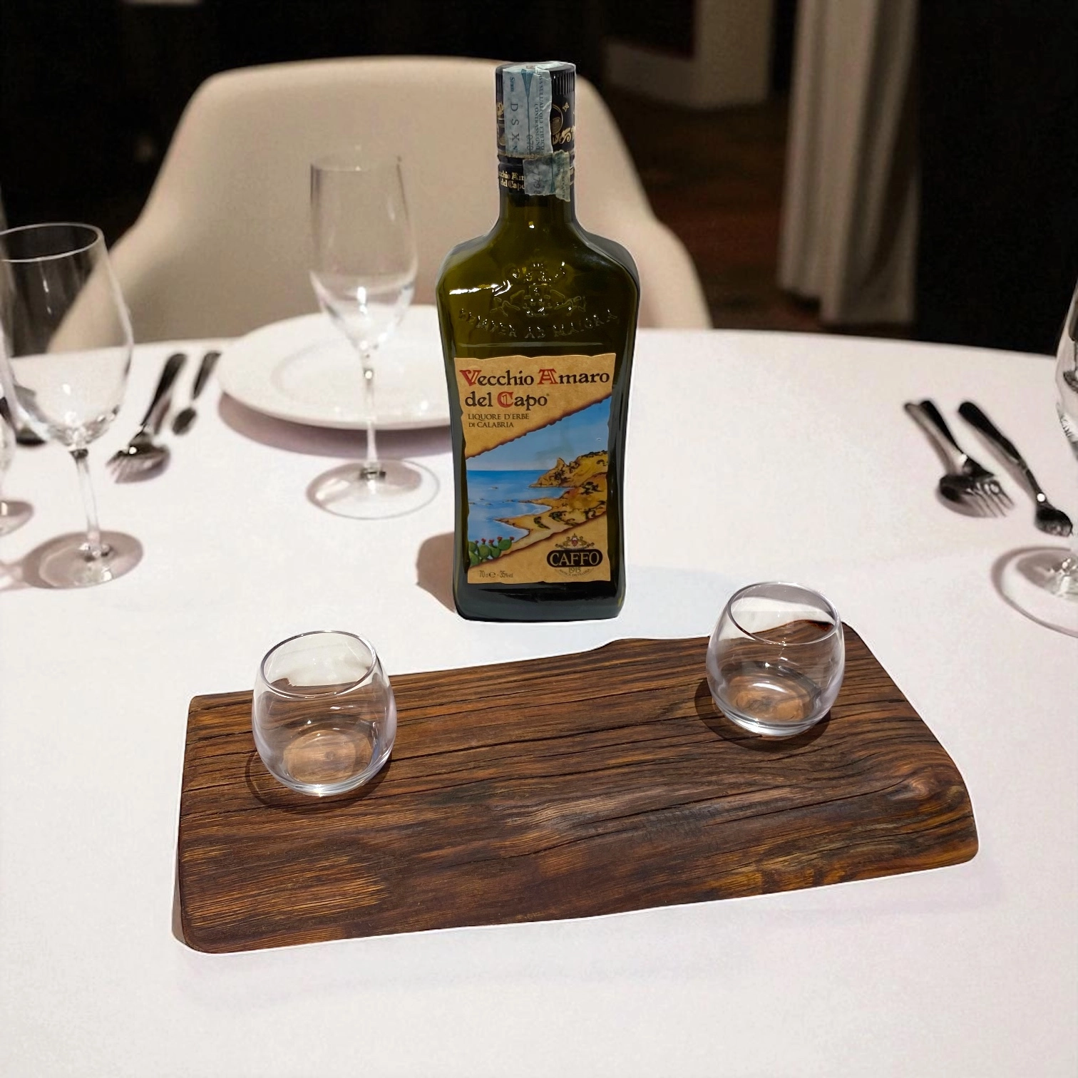 This handcrafted solid wood tray, designed to enhance tasting moments, features two elegant glasses for amaro or rum, providing the perfect space to rest the bottle and serve accompaniments such as dark chocolate, biscuits, or small desserts. A refined accessory that combines practicality and style, perfect for making every tasting experience unique.