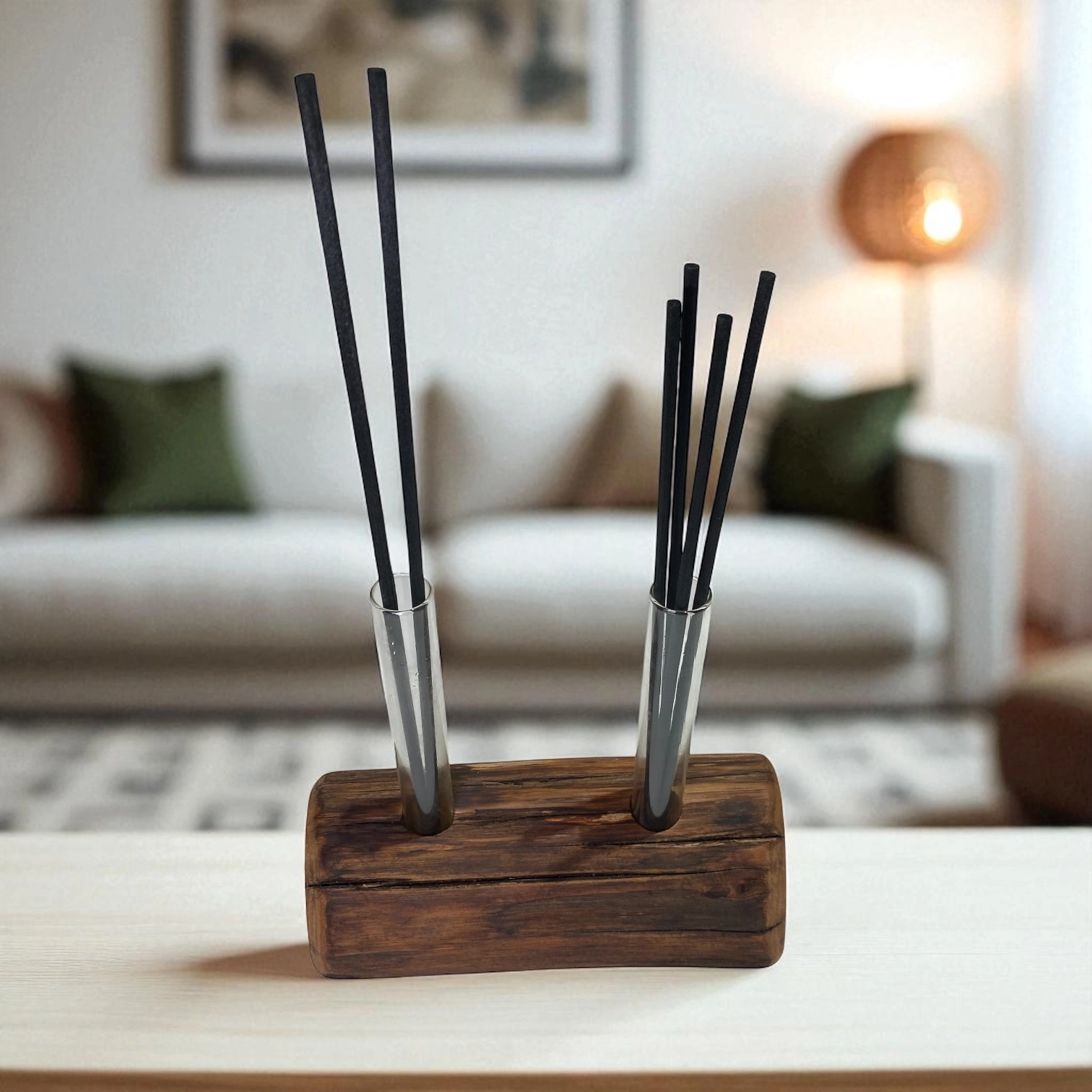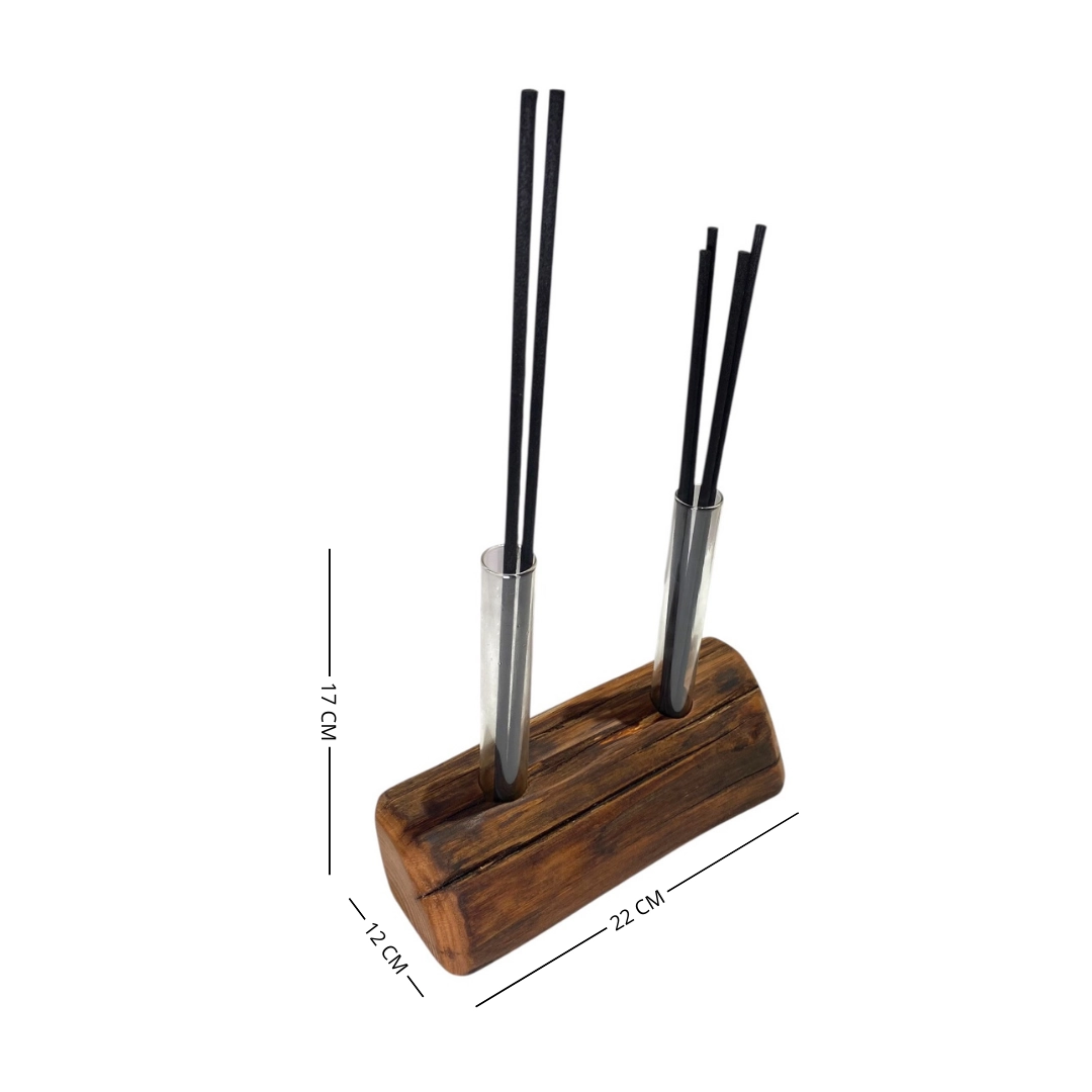 Porta fiori o profumatore per ambienti, con ampolle in vetro per fiori o oli essenziali. Prodotto lavorato a mano, ogni differenza in forma e dimensione rendono unico ogni pezzo.