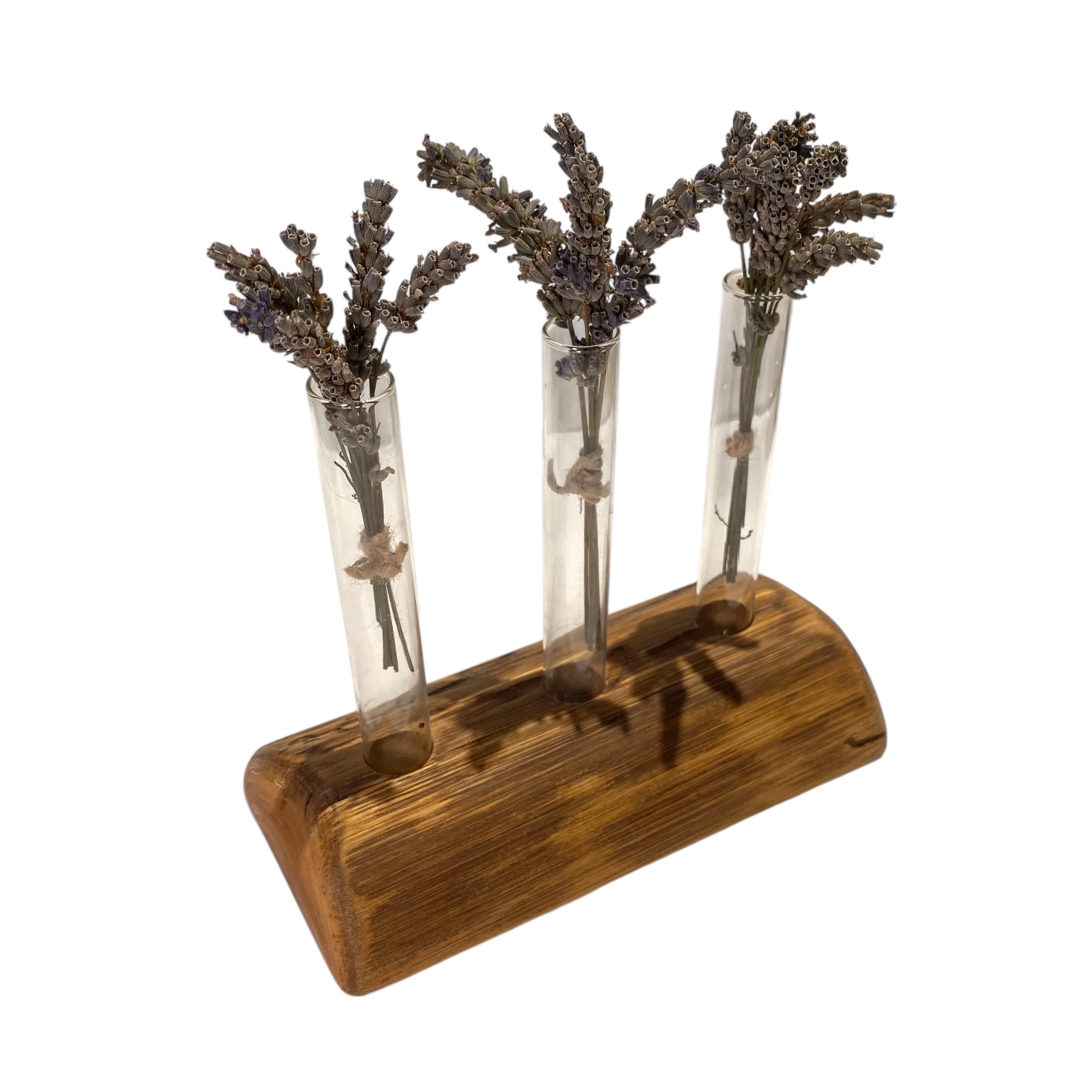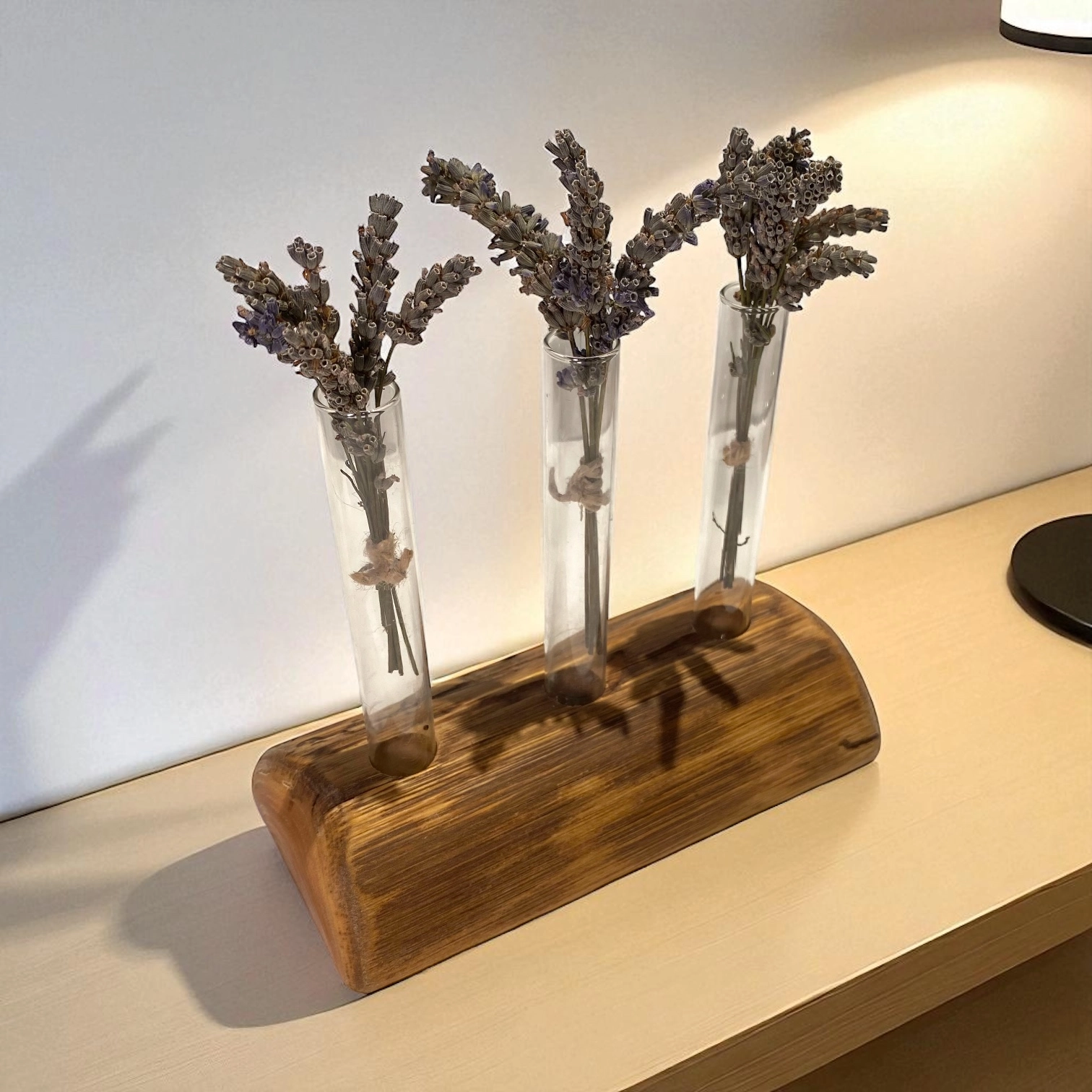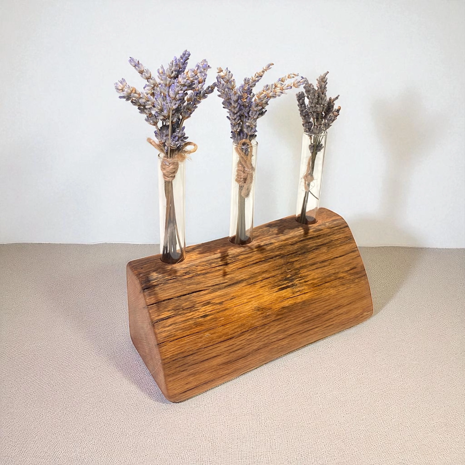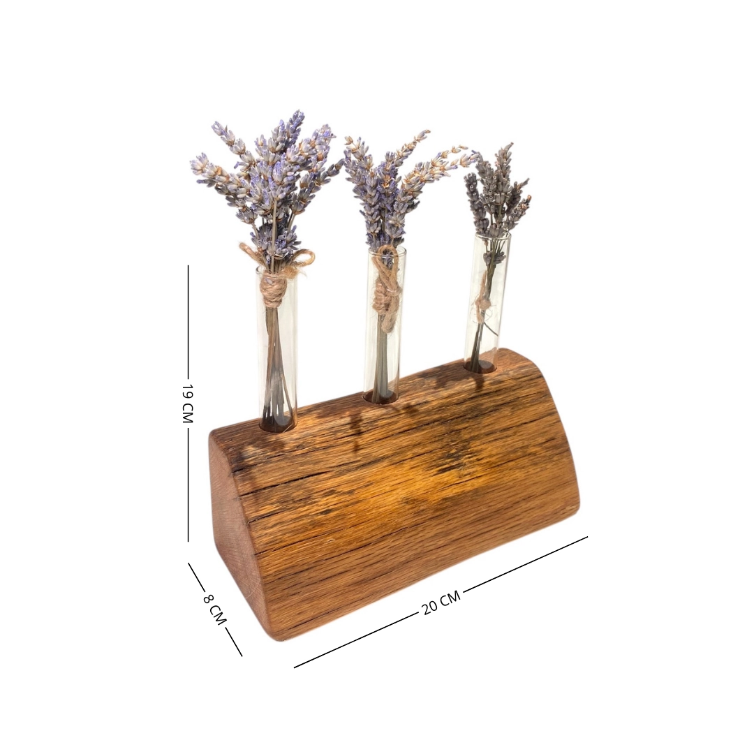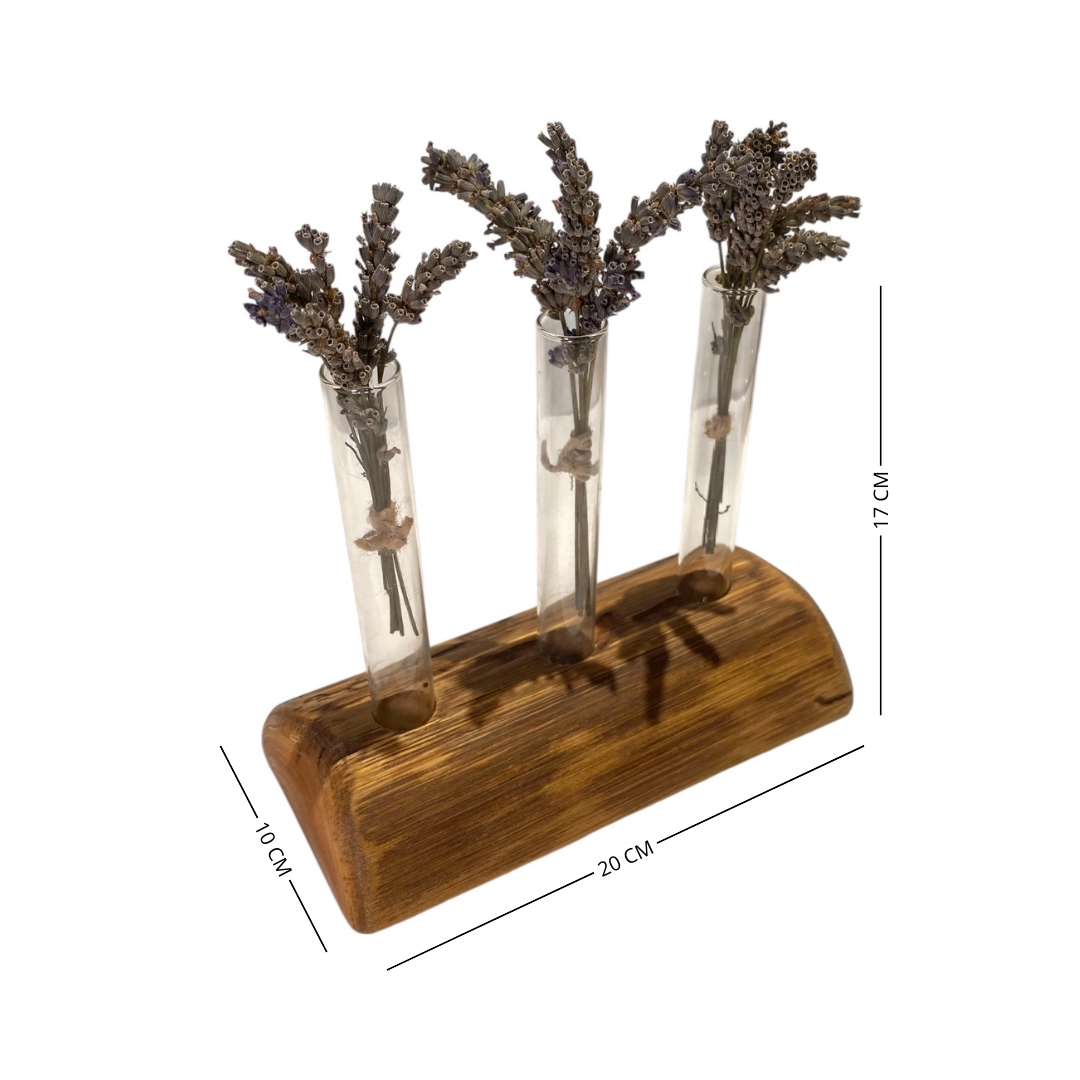 Porta fiori in legno artigianale realizzato a mano, dal design elegante e naturale. La struttura in legno massello valorizza le venature uniche del materiale, rendendo ogni pezzo irripetibile. Nella struttura sono inserite 3 ampolle in vetro, ideali per esporre piccoli fiori freschi, creare composizioni floreali originali o utilizzarlo come profumatore per ambienti. Un complemento d’arredo raffinato e versatile, perfetto per impreziosire tavoli, mensole o angoli della casa con un tocco di artigianalità e calore naturale.