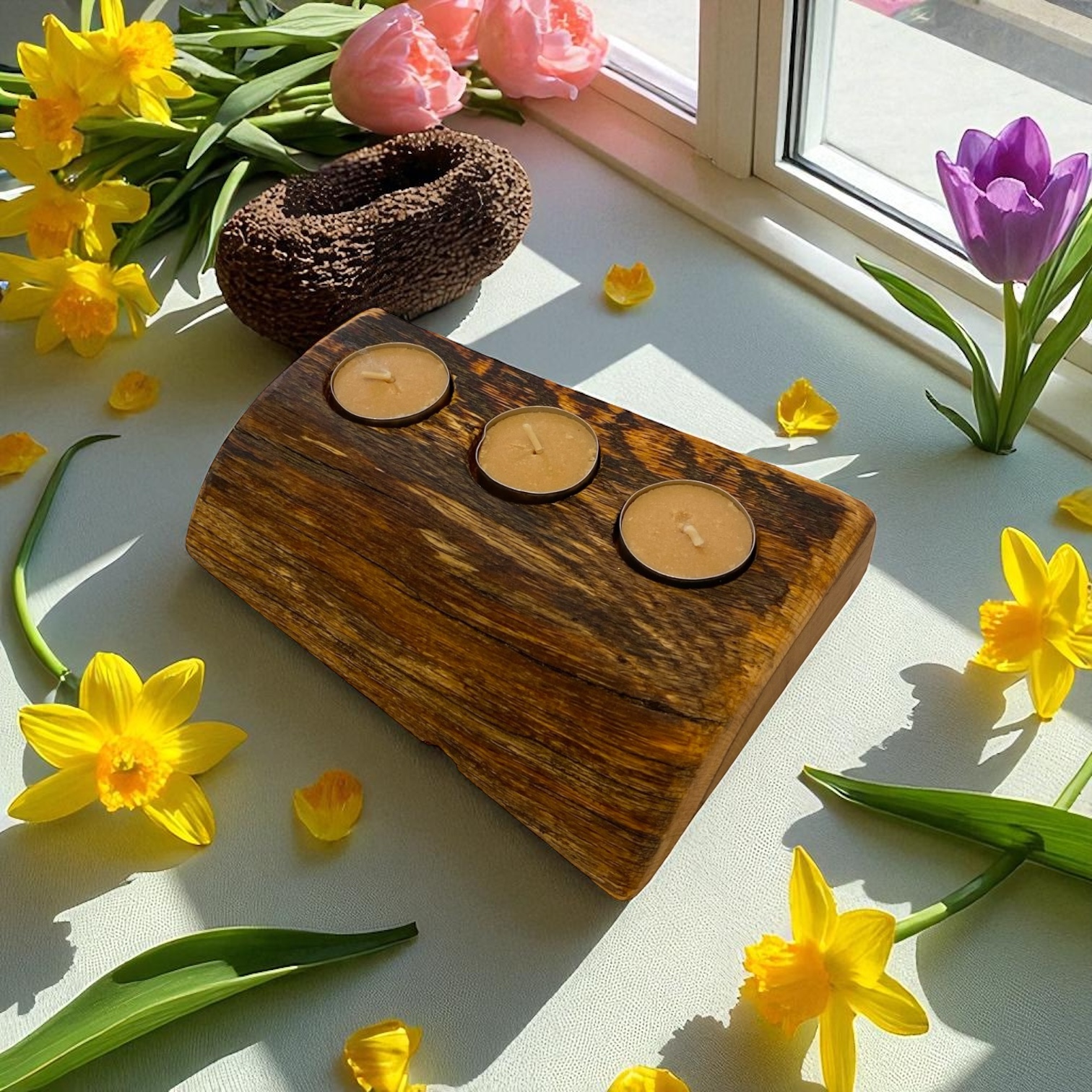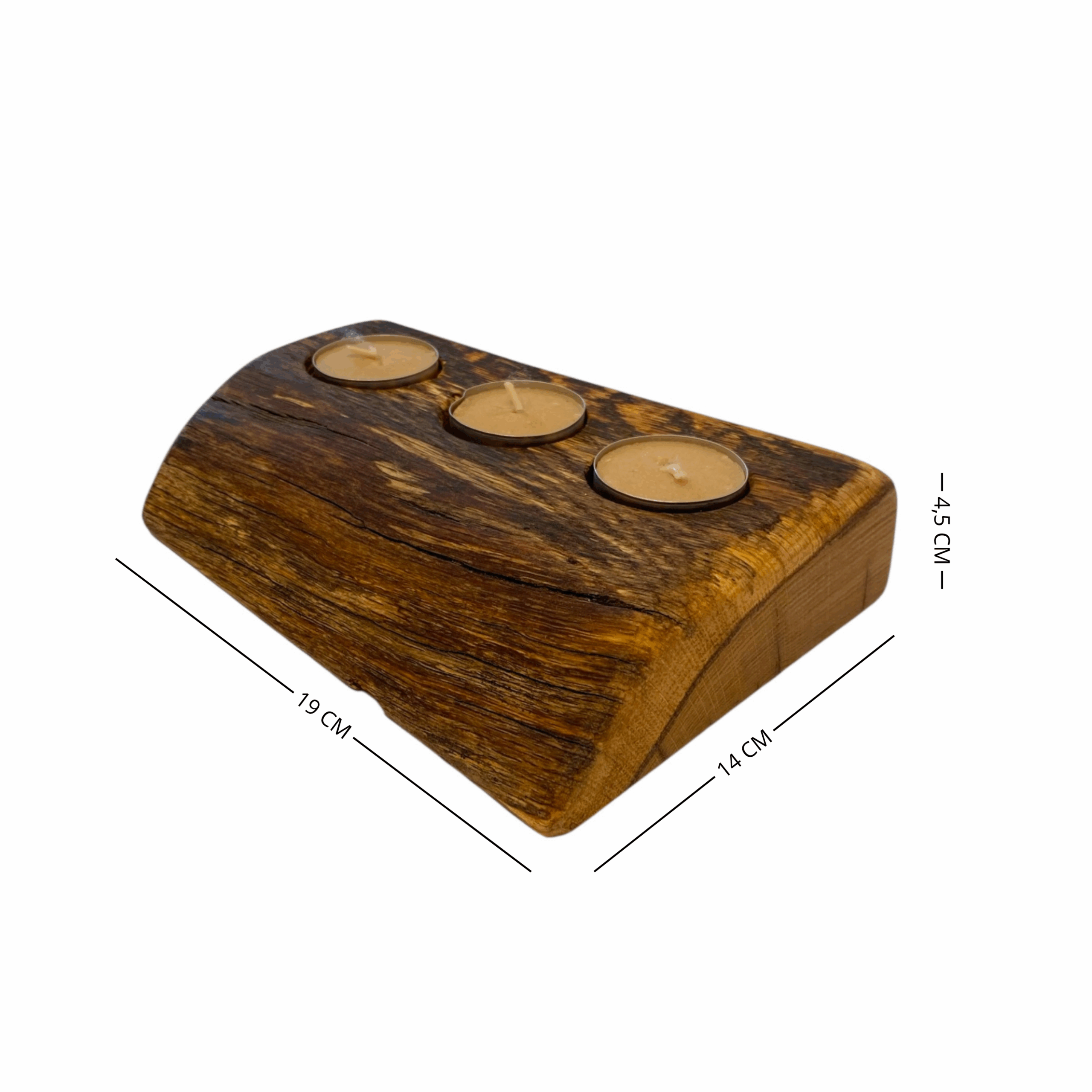 La lavorazione artigianale conferisce a questo porta candele un aspetto distintivo e curato, con finiture levigate a mano che mettono in risalto la texture del legno.