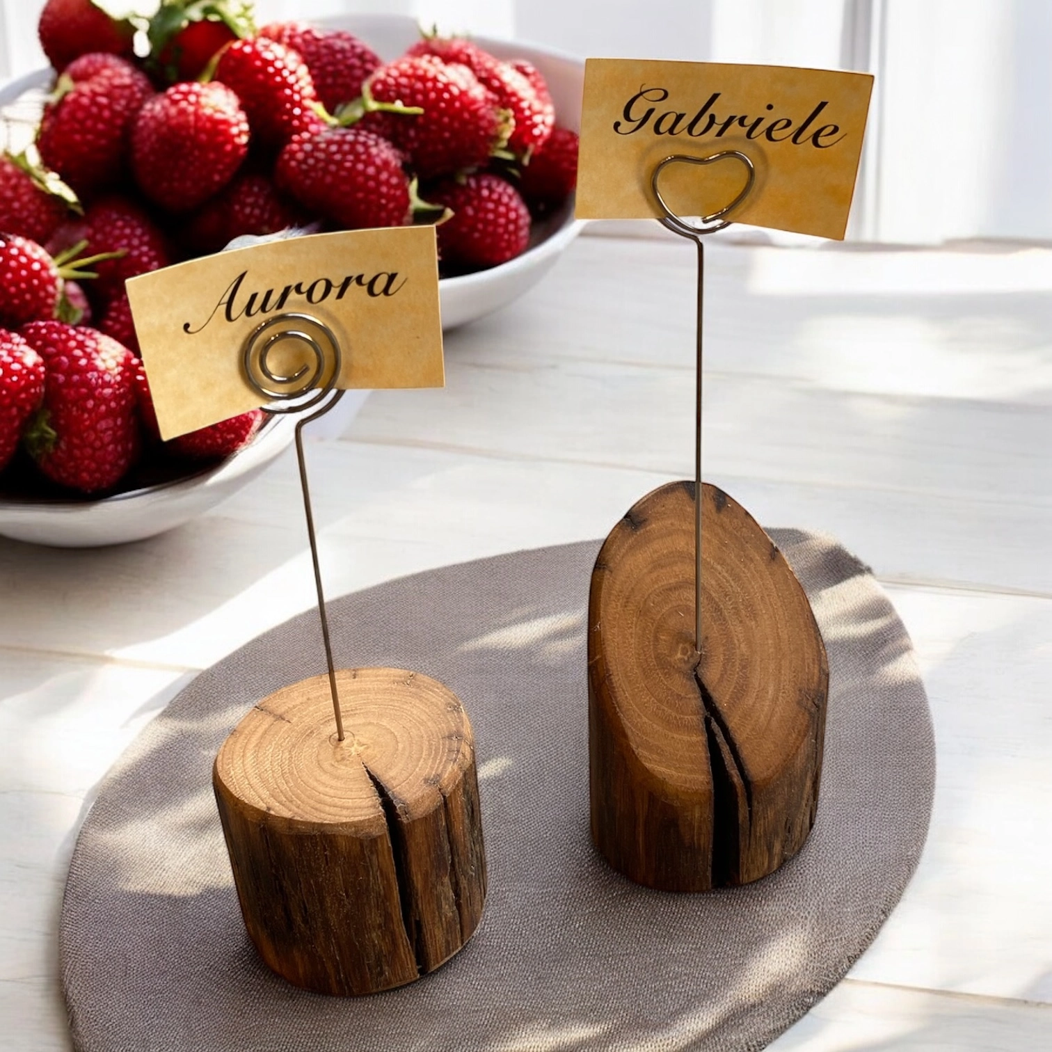 Al centro del legno è inserito un sottile ferretto sagomato, pensato per reggere con semplicità ed eleganza una fotografia, un biglietto o un cartoncino con il nome. La sua linea essenziale e minimalista lo rende estremamente versatile: può essere utilizzato come portafoto da appoggio per arredare casa, come segnaposto raffinato per matrimoni, cerimonie ed eventi, oppure come supporto originale per piccoli messaggi e memo sulla scrivania.