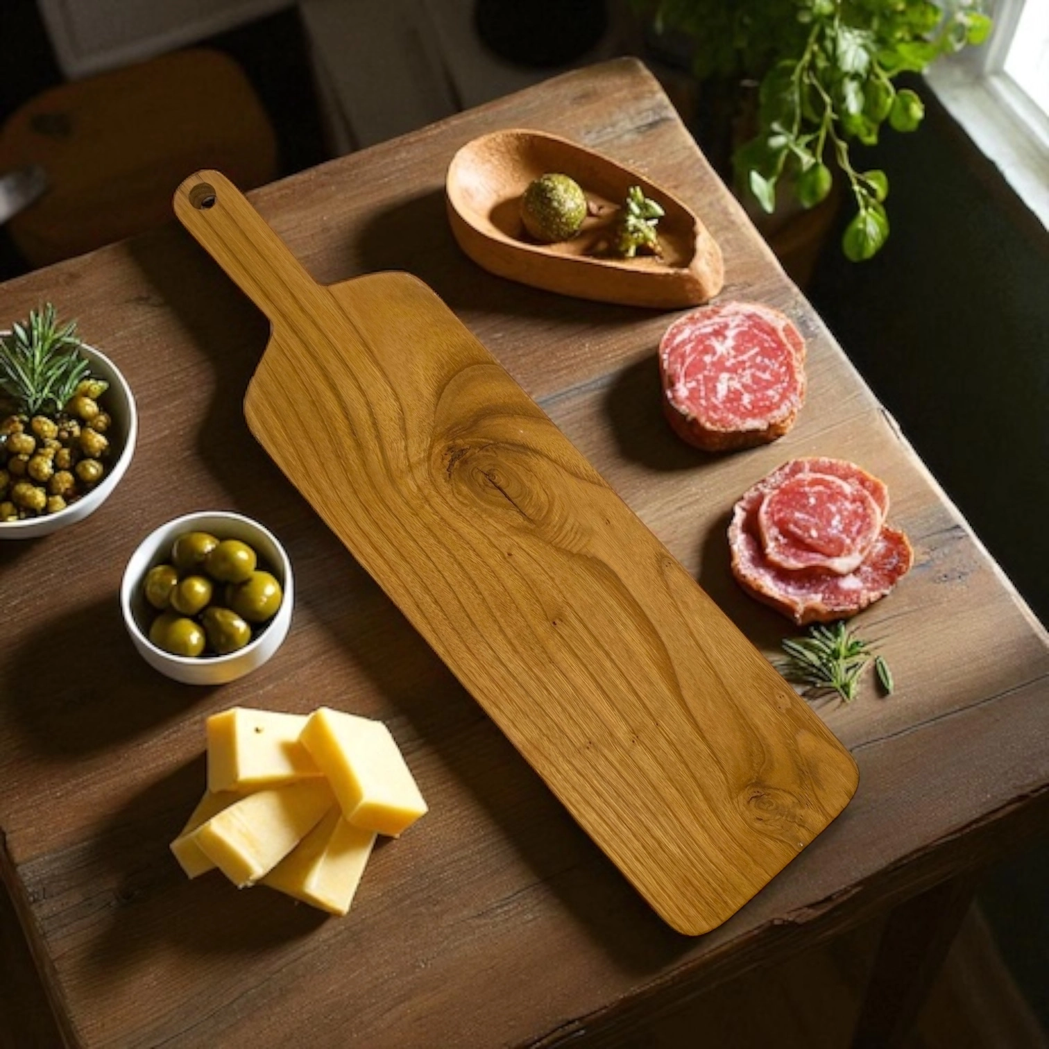 La forma del tagliere esalta la bellezza naturale del legno, rendendolo un vero e proprio oggetto d’arte da esporre in cucina. Il manico, progettato per garantire una presa comoda e sicura, facilita il trasporto e l’utilizzo del tagliere, rendendolo pratico anche per servire antipasti o formaggi direttamente a tavola.
