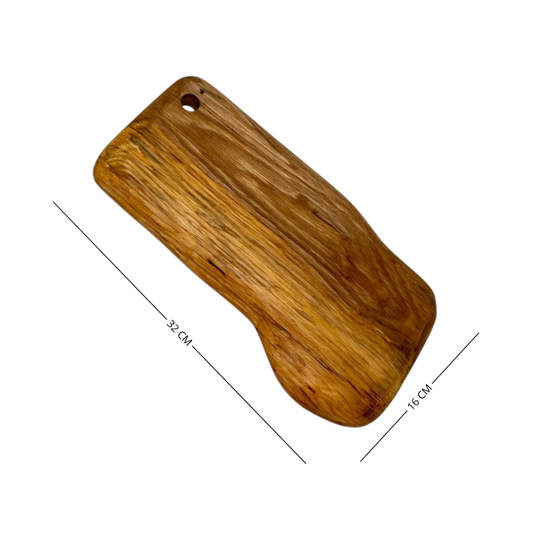 Tagliere artigianale in legno massello di quercia dalla forma irregolare.