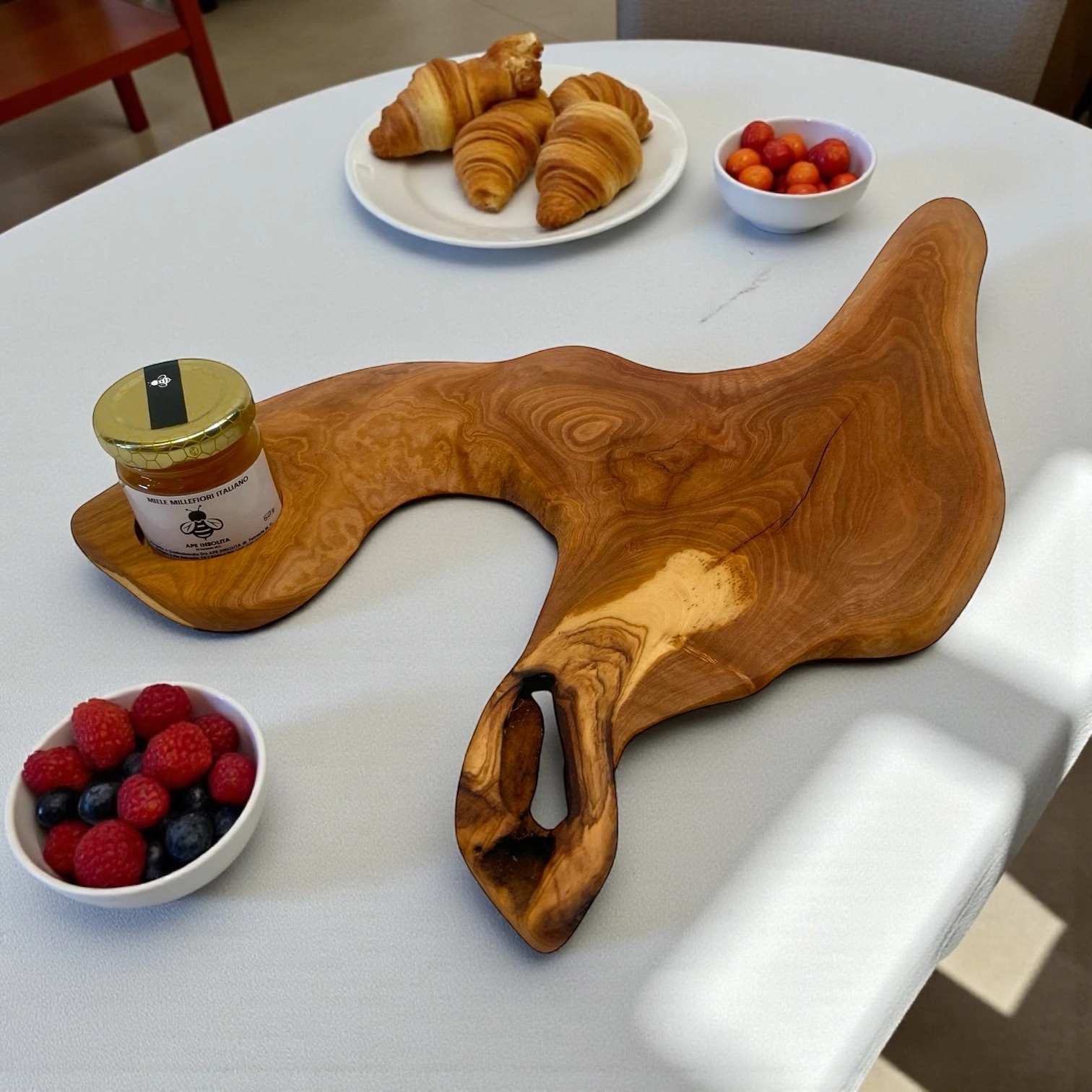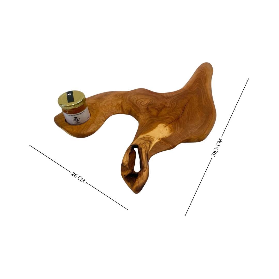 Ideale per servire colazioni, degustazioni o aperitivi, unisce la calda eleganza del legno d’ulivo alla genuinità dei prodotti locali. Può essere utilizzato come vassoio per formaggi, confetture o dolci, oppure come originale idea regalo gourmet.