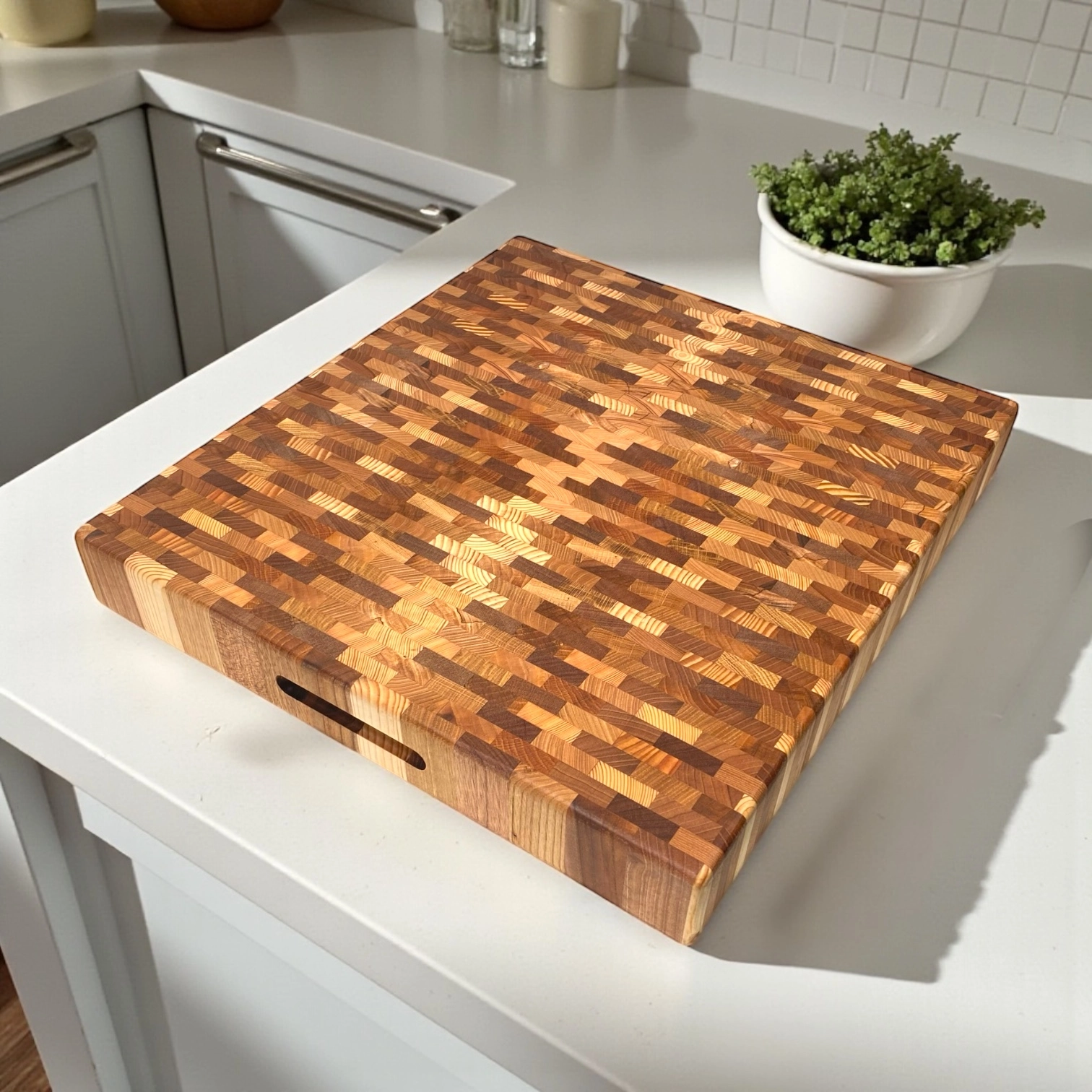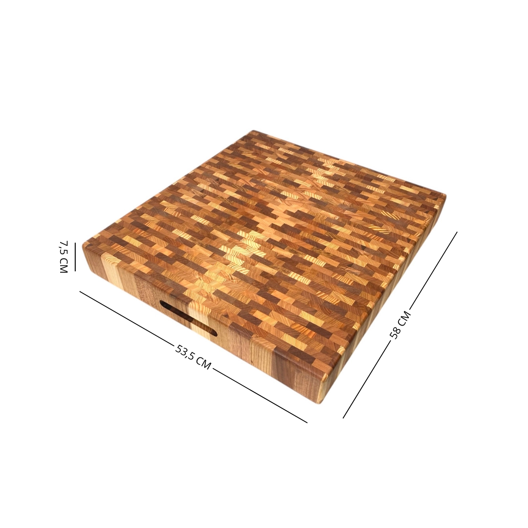 La lavorazione “di testa” rende il tagliere estremamente resistente e funzionale: le fibre verticali del legno assorbono meglio i colpi del coltello, preservando la lama e garantendo una lunga durata nel tempo. Pensato per un utilizzo professionale ma perfetto anche in ambito domestico, unisce solidità, stabilità ed eleganza.