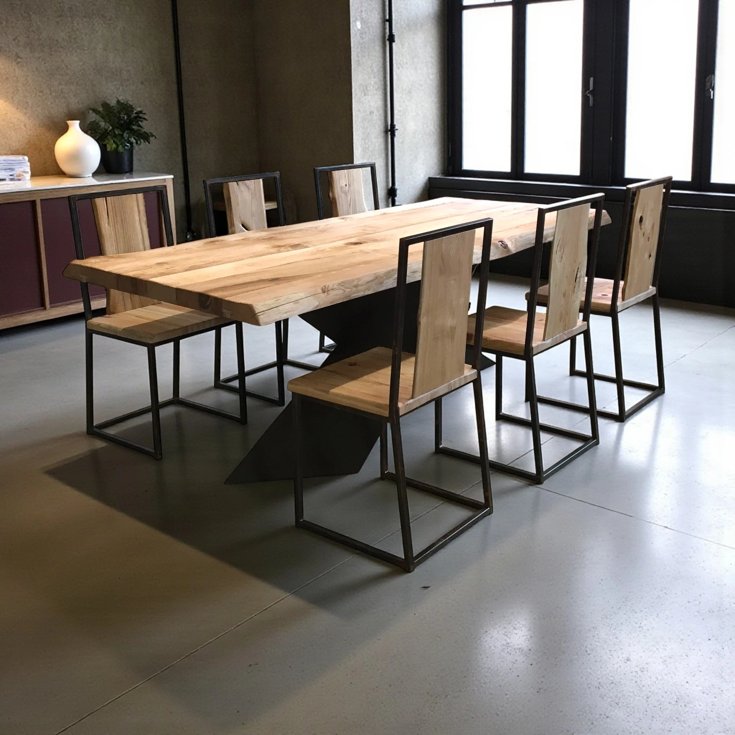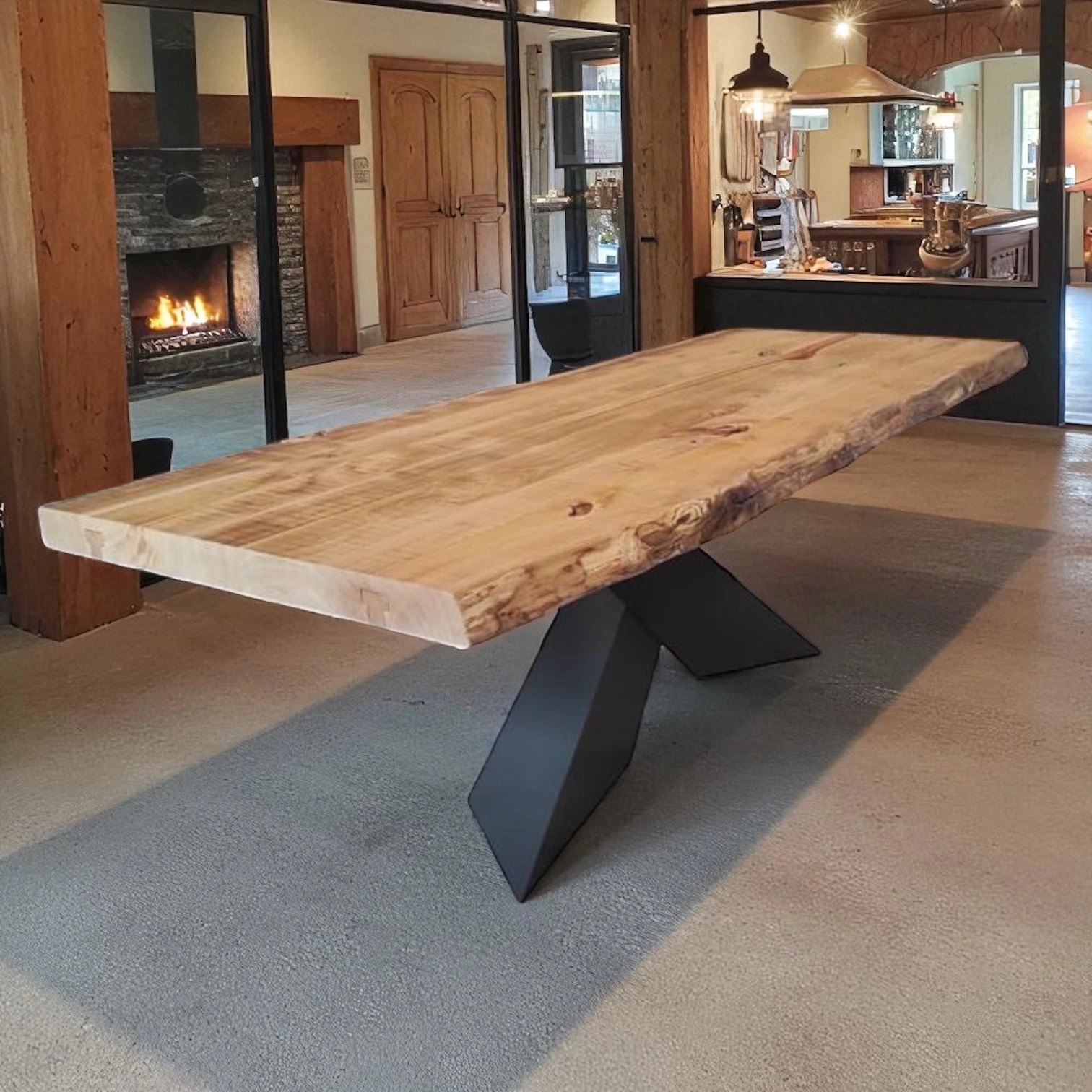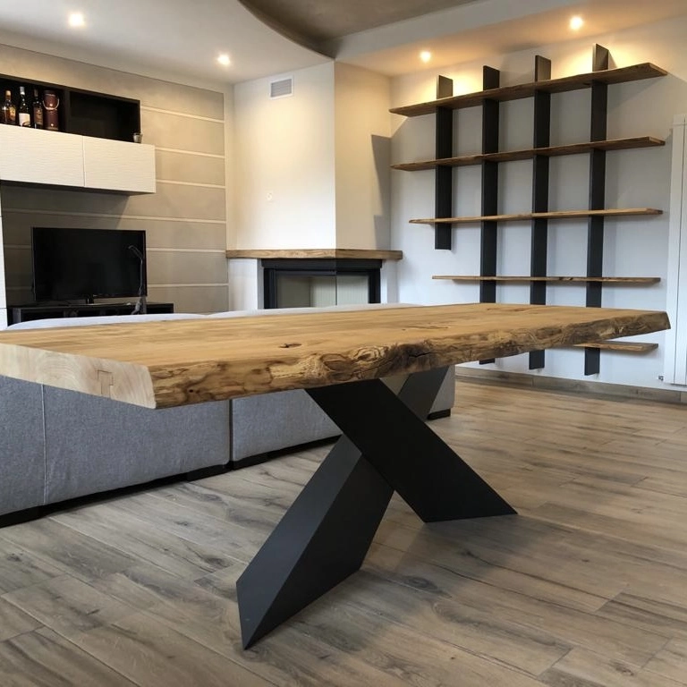 La solida gamba a croce con finitura effetto ferro conferisce un carattere deciso e contemporaneo, creando un perfetto equilibrio tra rusticità e stile industrial. Ogni tavolo è lavorato interamente a mano da artigiani specializzati: piccole differenze di forma, colore e dimensione sono il segno distintivo della sua autenticità.