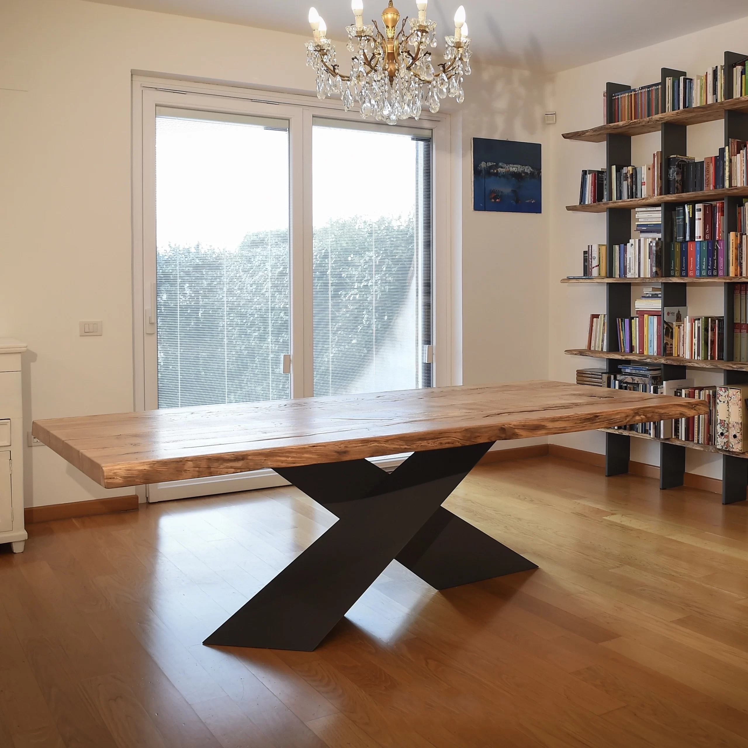 Tavolo artigianale in legno massello di castagno antico spessore 6cm con gamba a croce con finitura effetto ferro.