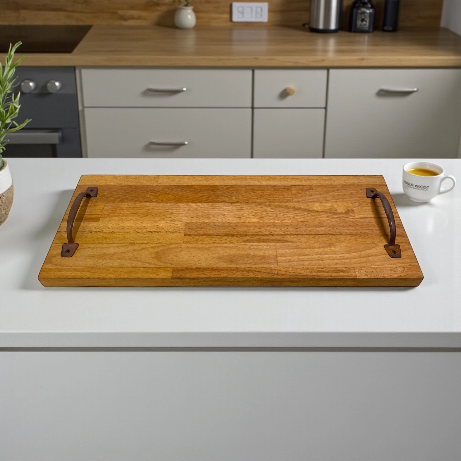 Questo elegante vassoio in legno massello di faggio lamellare unisce solidità, praticità e design artigianale.