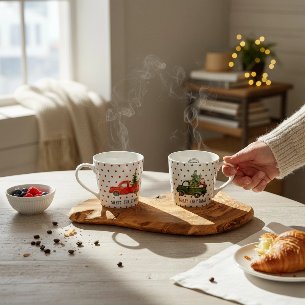 Rendi ancora più magica l’atmosfera delle feste con questo elegante set natalizio composto da vassoio in legno massello di ulivo e due tazze decorate a tema Christmas. Il vassoio, realizzato artigianalmente, presenta una forma irregolare che valorizza le venature uniche e naturali dell’ulivo, rendendo ogni pezzo diverso dall’altro. Le due tazze in ceramica, decorate con graziose illustrazioni di auto d’epoca con albero di Natale e scritta “Merry Christmas”, aggiungono un tocco caldo e festoso alla tua tavola. Ideale per servire tè, tisane, cioccolata calda o caffè durante le fredde giornate invernali, questo set è perfetto per condividere momenti speciali in famiglia. Ottima anche come idea regalo originale per Natale, unisce funzionalità e design artigianale, trasformando una semplice pausa in un’esperienza accogliente e ricca di stile.